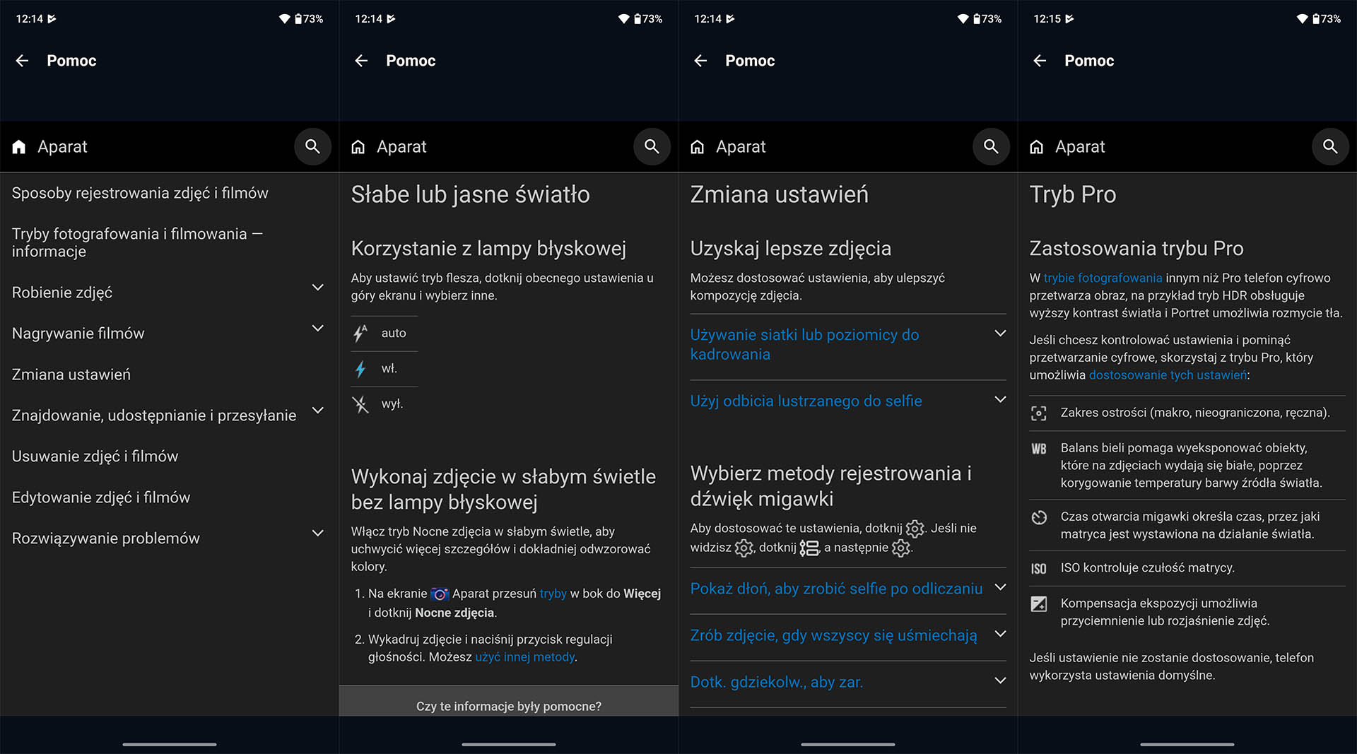 Zakładka Pomoc oferuje natomiast szczegółowe informacje na temat wszystkich trybów aplikacji aparatu i ich stosowania.