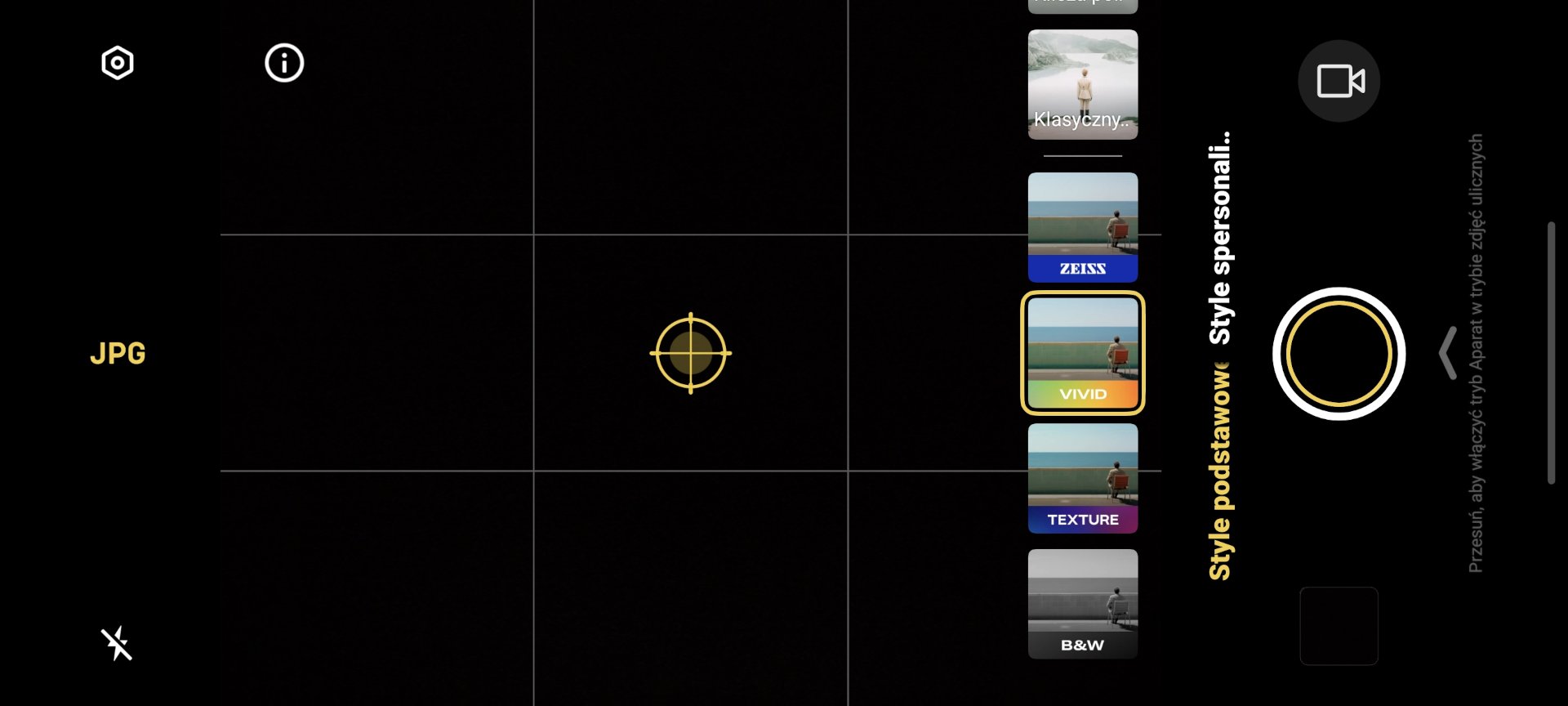 Zakładka fotografii ulicznej jest dostępna z poziomu głównego okna aplikacji aparatu. Oferuje symulację ogniskowych, klisz oraz ustawienia znane z tradycyjnych aparatów fotograficznych.